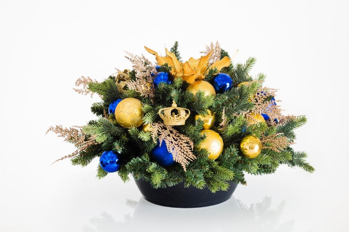 Balie tafelstuk / Kerststuk in pot Goud / Blauw